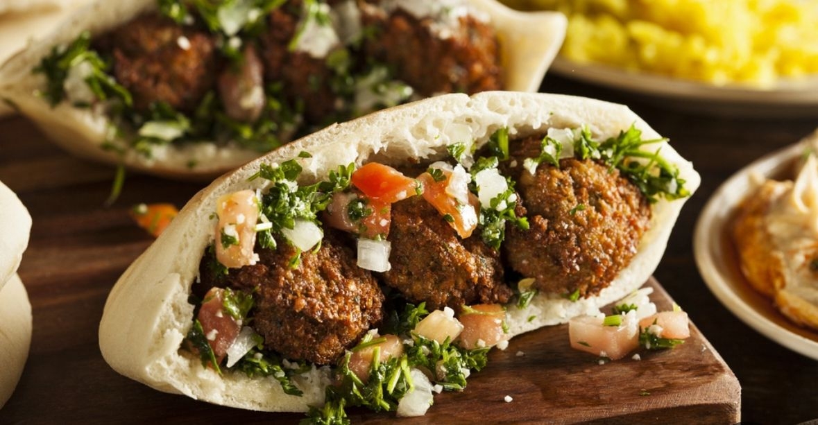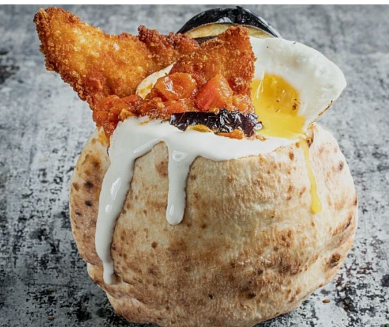 תערובת עגבניות ופלפלים קצוצים, בתיבול הבית, עם שתי ביצים ותוספות לבחירה, מוגש עם חצי באגט.